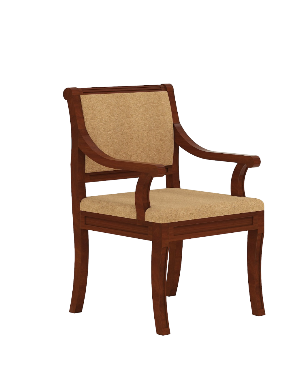 Our Dory Furniture Dining Chair is the largest upholstered back chair that we produce at Niagara and our most popular upholstered back chair. This is a great quality, solid mahogany. The Chair is designed with flowing lines, raised details, scrolled arms and splayed legs which all combine to give this item a lot of visual appeal. A super designer look all at a very reasonable price. Extra sturdy as well due to the use of glue blocks in the seat frame. Ships out with our most popular fabric so you can begin to use it the day it arrives!